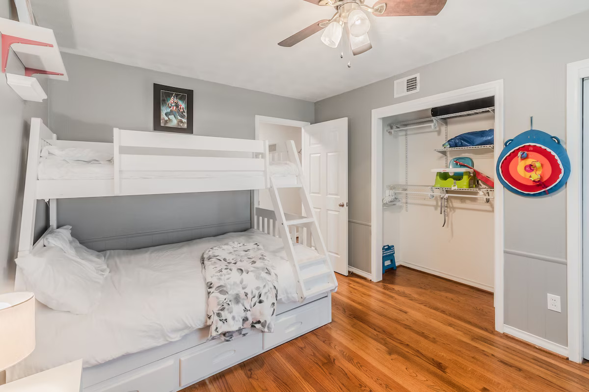 Family-Friendly: Bunk bed (full over twin), pack ‘n play for little ones, kids’ books and games.