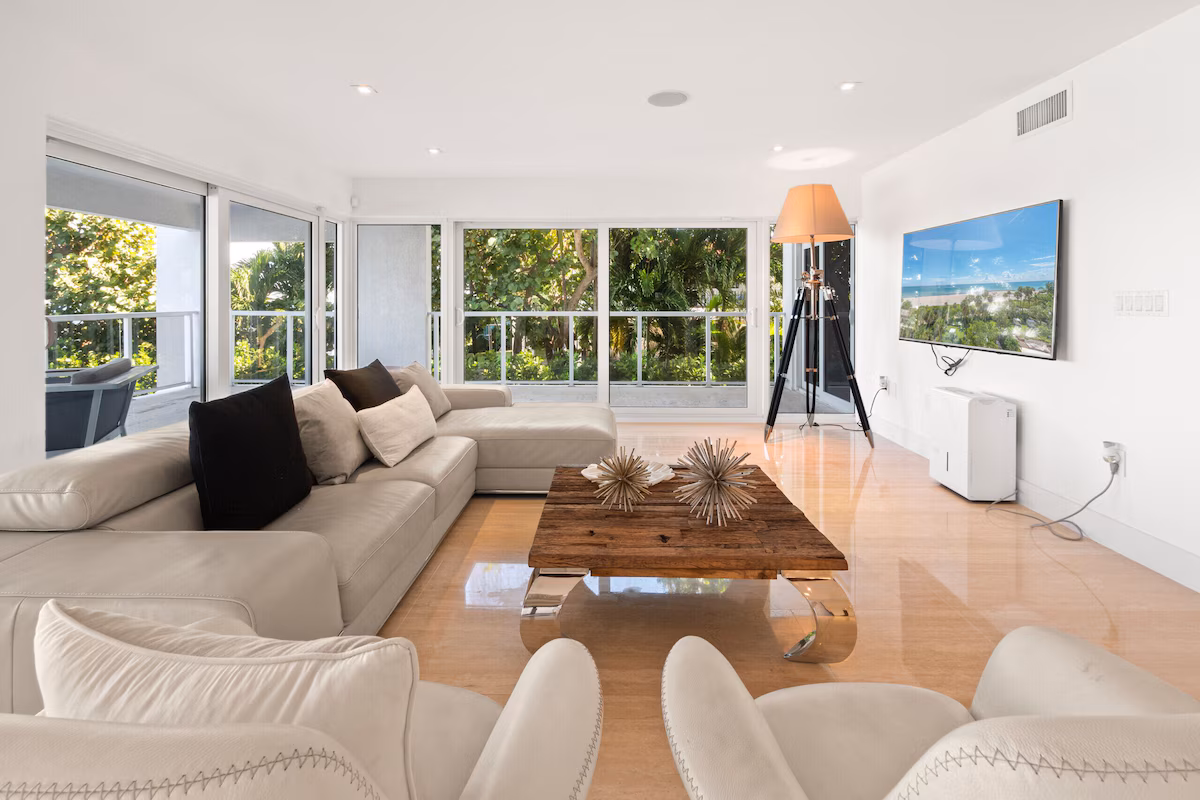 - Living Area: Bright and open with plush sofas, a flat-screen TV, and floor-to-ceiling windows that let the natural light pour in.